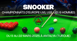 Les championnats d’Europe de snooker dans les catégories moins de 16 ans, moins de 18 ans, moins de 21 ans et hommes se dérouleront du 9 au 22 mars 2025 à Antalya en Turquie. Voici ci-dessous nos représentants français dans les différentes catégories : – Mateo Ochoiski sera en lice dans les catégories U16 (du 9 au 11 mars) et U18 (du 11 au 13 mars) – Malo Dory Geffroy jouera dans les tableaux U18 (du 11 au 13 mars) et U21 (du 13 au 17 mars) – Nicolas Mortreux , Grégory Kopec ,Jean-Marc Beauchamp (Wild Card) et Brian Ochoiski (Wild Card) concourront dans la catégorie Hommes (du 17 au 22 mars) Nous souhaitons une bonne compétition à nos Bleus ! – Toutes les informations sur la compétition